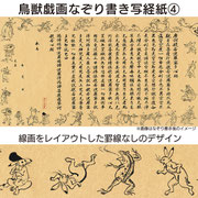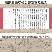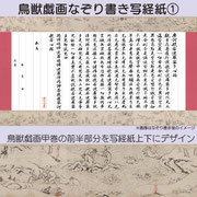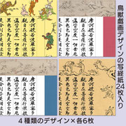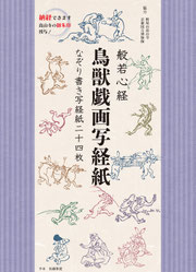 鳥獣戯画写経紙・・・鳥獣戯画甲巻の動物たちが写経紙の中で大活躍。全4種・各6枚、合計24枚の鳥獣戯画写経紙がついています。写経紙は薄影で般若心経のお手本が印刷されているので、筆ペンでなぞり書きするだけで立派な写経が完成します。お手本は書家、墨遊家・佐藤象寛先生筆による美しい般若心経です。