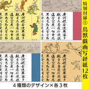 付録① 鳥獣戯画写経紙・・・鳥獣戯画甲巻の動物たちが写経紙の中で大活躍。全4種・各3枚、合計12枚の鳥獣戯画写経紙がついています。写経紙は薄影で般若心経のお手本が印刷されているので、筆ペンでなぞり書きするだけで立派な写経が完成します。お手本は書家、墨遊家・佐藤象寛先生筆による美しい般若心経です。